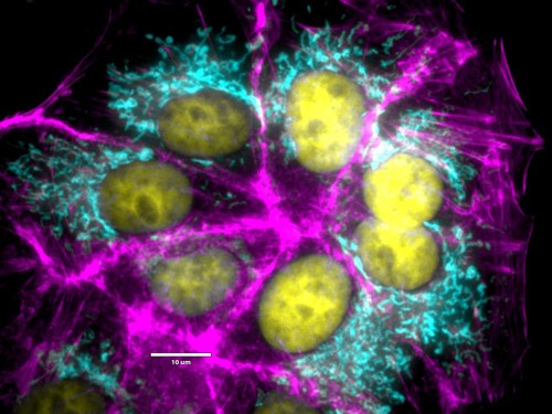 Vero E6 (ECACC 85020206): The standard cell line for producing viral stocks of SARS-CoV-2. Yellow: Cell Nuclei, Magenta: Actin Cytoskeleton, Cyan: Mitochondria. (Image courtesy of Ellie Drinkwater, NCPV).