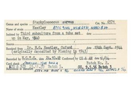 Naturally, an aspect of this work involved testing newly cultivated penicillin on grown cultures of species of pathogens it was intended to treat. Adopted into use by Norman Heatley, NCTC 6571 Staphylococcus aureus was added to the NCTC collection by Alexander Fleming in 1943, declaring in a letter that “all of us on the Penicillin Trials are using it”1. When developing a refined and standardised methodology for the assay of the concentration of penicillin by measuring the inhibition of growth of bacterial culture, NCTC 6571 was selected as a standardised test organism, and was already easily available for distribution to the scientific community. The strain quickly became NCTC’s second most highly distributed culture in 1944 and became known colloquially among bacteriologists as the “Oxford Staph” due to its extensive use by Florey’s team.