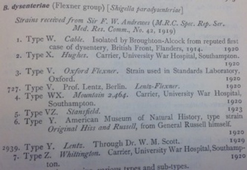 The first Director of NCTC, Dr Sir John Ledingham, was a consultant bacteriologist to the Forces in Mesopotamia in WW1. He published observations on dysentery and enteric fever based on his war experience so it might be expected that the first ever bacteria deposited in NCTC in 1920 were seven strains of Shigella flexneri, some of which had been isolated from soldiers with dysentery. In the early 1900’s Shigella flexneri, then named ‘Bacterium dysenteriae’, was a recently-recognised pathogen. Japanese microbiologist, Kiyoshi Shiga, established the distinction between bacillary and amoebic dysentery in 1898 and during the two decades following this discovery, many other ‘Bacilli’ were recovered from patients with epidemic or endemic dysentery and shown to be the causative agents of disease.