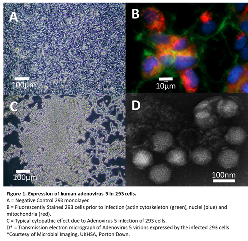 Figure 1 shows the typical morphology of the 293 cell line under standard light microscopy (1A) and when its actin, nuclei, and mitochondria are stained (1B). These healthy 293 cells are in contrast to the typical cytopathic effect (CPE) observed following human Adenovirus 5 infection (1C) where the 293 cells form large floating aggregates. The typical icosahedral morphology of the human Adenovirus 5 virions is shown by transmission electron microscopy (TEM) (1D).
