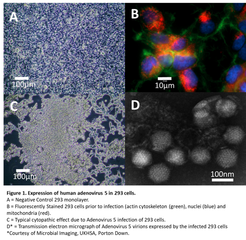 The human embyonic kidney cell line '293' (ECACC 85120602) was originally generated through transformation of human embryonic kidney cells with adenovirus DNA. These cells are often used as a transfection host and in the field of virology. Recently, scientists from the National Collection of Pathogenic Viruses (NCPV) used the 293 cell line as a host to express human Adenovirus 5 (NCPV 0011055v) in cell culture systems whilst exploring the effect of adenovirus infection on cell morphology.