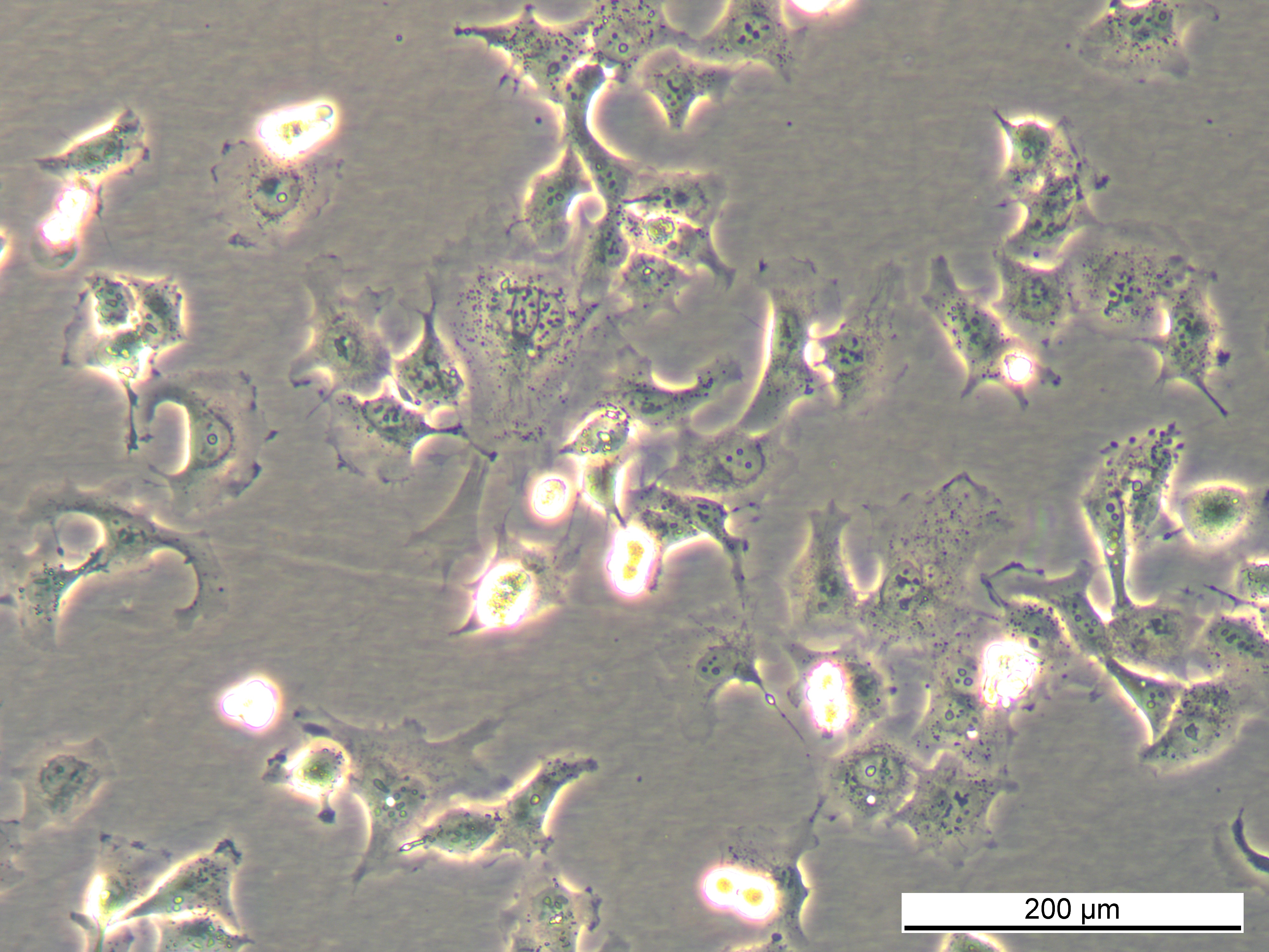 In isolation, these cells are of intermediate size, with irregular elongated shapes and possess short neurite-like processes. They do not form colonies in monolayer culture, but instead grow in a scattered manner, with some cells extending across neighbouring cells. In the mixed parental population, these cells have a more regular flattened appearance, but again, they do not form colonies.