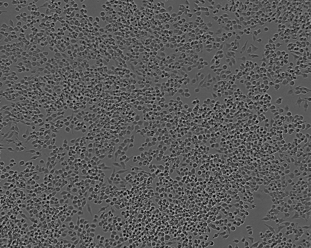 Split sub-confluent cultures (70-80%) 1:2 to 1:8 i.e. seeding at 2-4x10,000 cells/cm²; 5% CO₂; 37°C. Use cell scrapers to remove attached cells. Cells are semi-adherent, i.e. some cells grow in suspension, some loosely attach to the surface and others flattened out and attached to the flask. Cells should not be allowed to overgrow and become confluent as this can lead to loss of the flattened adherent cell characteristic.